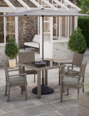 With its woven, rattan-effect finish, this Marlow dining set makes a timeless addition to your outdoor space. The four armchairs are complete with comfortable seat cushions, while the square table has a sleek glass top for a contemporary aesthetic. A centre hole in the table allows for the placement of a parasol.