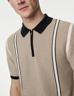 Make an immediate impact in this eye-catching cotton-rich knitted polo shirt. A half-zip helps you slip it on and off easily. Design features stripes across the chest with matching cuffs and hems and four-stripe tipping on the collar.n M&S Collection: easy-to-wear wardrobe staples that combine classic and contemporary styles.