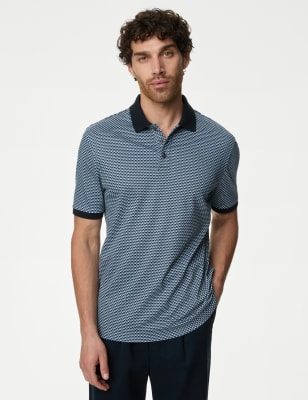 M&S Men's Pure Cotton Leaf Print Polo Shirt - MREG - Navy Mix, Navy Mix