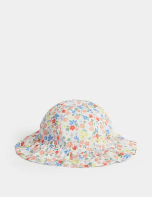 M&S Pure Cotton Reversible Sun Hat (0-1 Yrs) - 6-12M - Coral, Coral,Aqua