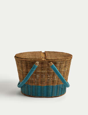 The traditional style of this rattan hamper makes it perfect for picnics as well as an attractive storage solution. It features one main compartment with a button-closing lid along with handy drink holders on the side. For easy portability, the design is complete with a wide carrying handle at the top.