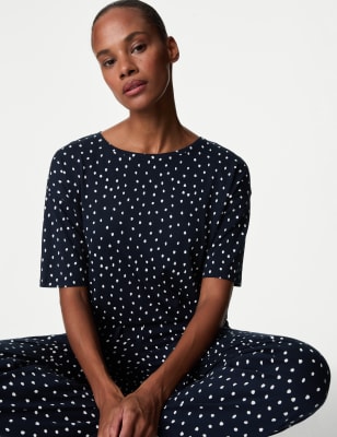 Refresh your sleepwear with these cotton-modal pyjamas, featuring a distinctive all-over print. Comfy regular fit set, comprising a button-up top and long bottoms with an elasticated waist. An open collar neckline and contrast piped trims add to the crisp, timeless look.nM&S Collection: versatile styles in modern shapes with unique and playful details.