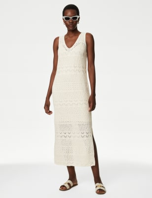 This knitted dress is made from cotton-rich material for breathability. The regular-fit, crochet-inspired design features a neat tie fastening at the bold v-neck to give a flattering look. It comes in an on-trend mini length, and the all-over textured fabric creates a comfy feel. The 3/4-length sleeves provide an airy finish.n M&S Collection: easy-to-wear wardrobe staples that combine classic and contemporary styles.