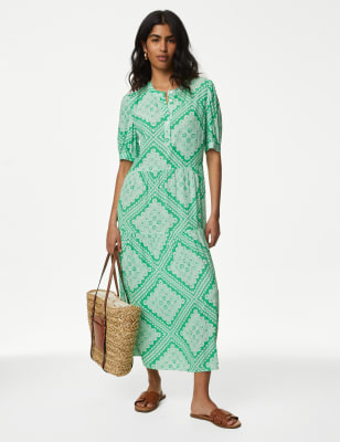 This tea dress is made from soft jersey for a comfortable feel. It's designed in a regular fit and features a flattering tie belt at the waist. The round neck and long sleeves offer a timeless look. Added stretch in the fabric ensures plenty of flexibility. This piece is complete with a tier on the midi-length skirt for extra volume.n M&S Collection: easy-to-wear wardrobe staples that combine classic and contemporary styles.