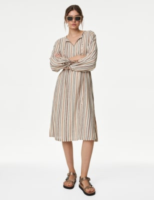 M&S Women's Linen Blend Midaxi Swing Dress - 14REG - Natural Beige, Natural Beige