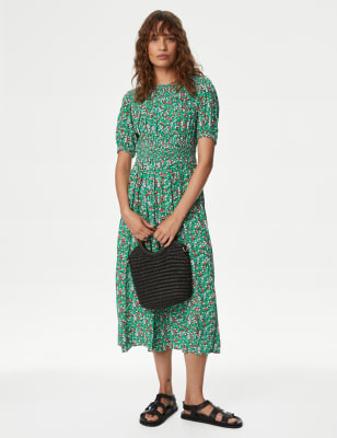 M&S Women's Printed Collared Puff Sleeve Midi Shirt Dress - 12REG - Green Mix, Green Mix