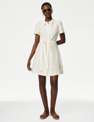 This lightweight shirt dress is a versatile style for warmer days. It's cut in a regular fit, with a smart collared neck and a button-through bodice. A tie fastening adds definition to your waist, while the puffed short sleeves bring a feminine touch. This mini-length piece is finished with an eye-catching print.n M&S Collection: easy-to-wear wardrobe staples that combine classic and contemporary styles.