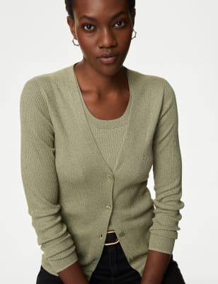 M&S Women's Sparkly Crew Neck Knitted Vest - 8 - Faded Khaki, Faded Khaki,Ecru,Pink Shell