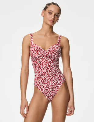 This printed swimsuit is designed to flatter your figure. Regular fit, with added stretch for comfort. A plunging halterneck is adjustable for a striking look, and the padding gives a smooth feel. Secret Slimming and Magic 360 Tummy Control technologies provide a flattering shape from every angle.n M&S Collection: versatile styles in modern shapes with unique and playful details.