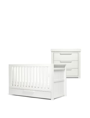 If you're all about elegant design for your little one's nursery, the Mia collection will fit right in. Designed and developed in-house at Mamas & Papas, it pairs traditional sleigh curves with contemporary straight lines. And because these timeless pieces are adjustable, organising baby's room is a breeze. Get your nursery kitted out with the 2 Piece Mia Cotbed Set. Including a convertible cot to toddler bed, and a dresser changer, these pieces have plenty of storage, with a built-in drawers and adjustable rails. So you can organise your little one's bedroom in a way that suits you. Mattress shown in cotbed is not included, this must be purchased separately.