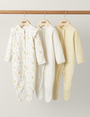 This pack of three sleepsuits from Mamas & Papas will make an adorable addition to your baby's wardrobe. They're crafted from pure cotton fabric that feels soft against their delicate skin. Each style has long sleeves with integral scratch mitts, plus built-in feet and centre popper fastenings for easy dressing. This pack includes floral and rabbit print designs with a sweet scallop neckline, plus one plain style with a pretty frill collar.