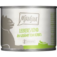 Your cat is bored with eating? MjAMjAM Duo 6 x 200 g brings variety to their diet! The fantastic meat combinations will blow your cat away and make every meal time a special treat. The wet food is protein-rich and contains lots of fresh meat, which can support your cat's muscles. On top of that, crunchy vegetables or juicy berries provide a balanced diet full of nutrients. Your cat will visibly feel better and thank you with bright eyes and contented purring. With MjAMjAM Duo 6 x 400 g you are not only doing something good for your cat, but also for its sensitive stomach. The food is free from artificial preservatives, gluten, grain-free and lactose-free. So your cat can enjoy its meal time without hesitation. MjAMjAM Duo 6 x 200 g at a glance: Delicious wet cat food Choice of different varieties: hearty delicious meat combinations Natural nutrition: with extra meat and proteins Rich in taurine: for normal vision and heart function Shiny fur: zinc and valuable fatty acids from linseed oil Normal immune system: vitamin E and D3 contribute to the natural immune system No artificial preservatives: so your cat only gets the best No grain, no gluten : perfect for cats with sensitive stomachs Gentle on the intestines: lactose-free recipe for optimal digestion Pure and quality ingredients: free from meat-and-bone meal and vegetable by-products Tooth-friendly: contains no added sugar No leftovers: perfectly portioned cans for stress-free feeding Top quality from Austria