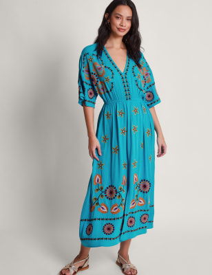 Bring a touch of bohemian style to your wardrobe with this Monsoon tea dress. It's made in a regular fit with a flattering waisted shape and a flowing midi-length skirt. This piece is complete with a v-neckline, covered button fastening and sheer three-quarter sleeves. Delicate sequin floral embroidery finishes the design.