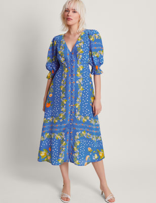 Monsoon Women's Floral V-Neck Button Through Midi Tea Dress - 8 - Blue Mix, Blue Mix