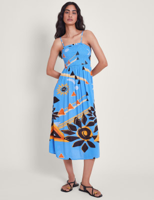 This floral Monsoon tea dress is a feminine style that's perfect for sunny days. It's designed in a regular fit, with a v-neckline and gathering under the bust for a flattering silhouette. The skirt falls to a versatile midi length and features contrasting patterns at the hem for a striking look. This piece fastens with buttons through the front and is complete with floaty short sleeves.