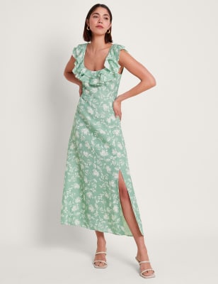 Monsoon Women's Floral V-Neck Ruffle Midi Waisted Dress - 20 - Green Mix, Green Mix