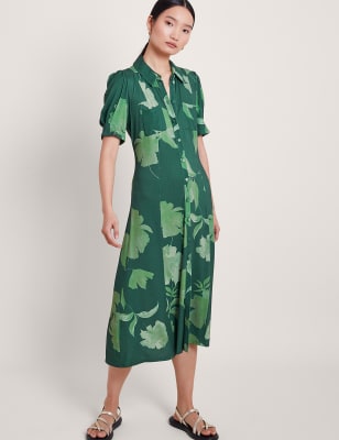 Bring a bold touch to your wardrobe with this leaf print shirt dress from Monsoon. It's designed in a regular fit, with a lace trim at the collared neckline and button-through fastenings. The long sleeves are gathered at the shoulders to create on-trend volume, and finish in neat elasticated cuffs. This piece is complete with a waist-cinching self tie belt and has a flowing maxi-length hemline.