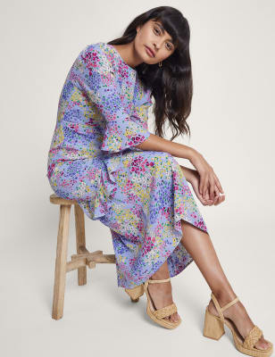 Bring a bohemian-inspired feel to your wardrobe with this printed dress from Monsoon. It's cut to a regular fit, with a flattering waisted silhouette and an elegant v-neckline. The long sleeves are elasticated for a touch of volume. This piece fastens with a zip and keyhole button at the back and is complete with a versatile midi-length hem.
