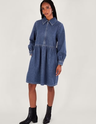 Monsoon Women's Pure Cotton Collared Knee Length Skater Dress - M - Blue Denim, Blue Denim,Ecru