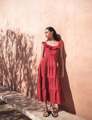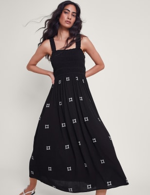 This pure cotton maxi dress from Monsoon is a dreamy choice for warmer days. It's designed in a regular fit, with a flattering waisted silhouette and a sweeping tiered skirt. A strappy bodice with a square neckline and back offers an elegant look. The dress is complete with intricate embroidery for a beautifully detailed finish.