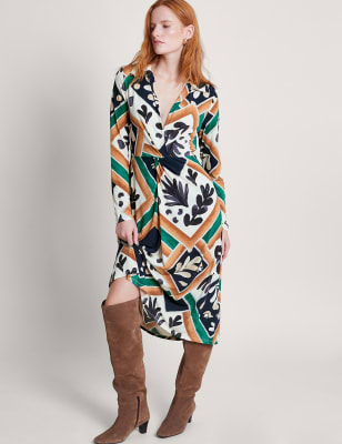 This Monsoon shirt dress is crafted from smooth pure cotton jersey fabric for a soft and comfortable feel. It's cut in a regular fit, with a neat collared v-neckline and a button-through fastening. The sleeveless design falls to a versatile midi length. This piece is complete with a striking all-over print.