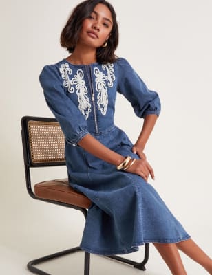 This Monsoon dress is crafted from pure lyocell for a lightweight and breathable feel. It's cut to a regular fit, with an easy smock silhouette and a feminine v-neckline. This knee-length piece is complete with intricate embroidery and a classic button-through front.