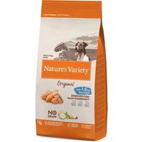 The smaller the dog, the greater the demands? One thing is certain: puppies and young dogs have very special nutritional needs in the first year of life, which is why it is important to feed them a food that is tailored to their needs. Nature's Variety Original No Grain Junior - Salmon has been specially developed for puppies up to 12 months and provides your pet with an optimal supply of energy and nutrients. Thanks to its special ingredients, this dry food can support the normal development of teeth and bones as well as the sense of sight and brain. It is prepared with lots of salmon, which provides high-quality proteins, and also contains selected vegetable ingredients. Nature's Variety Original No Grain Junior - Salmon is a grain-free puppy food that instead contains sweet potatoes, peas and chickpeas as carbohydrate sources. Added to this are various types of fruit and vegetables to ensure an optimal supply of vital nutrients. Nature's Variety Original No Grain Junior - Salmon at a glance: Dry food for puppies and young dogs from 2 to 12 months. Especially for young dogs: ingredients optimally adapted to the needs of young dogs in their 1st year of life Prepared with delicious salmon: contains lots of high-quality, deboned fish, very good taste, source of animal proteins Grain-free: suitable for puppies and young dogs with allergies and intolerances. Energy-rich and digestible: with sweet potatoes, peas and chickpeas as sources of carbohydrates Plant-based ingredients with valuable vital substances: enriched with fruits, vegetables and "Superfoods", provides important dietary fibres, vitamins and minerals Immunity: contains antioxidants, can contribute to a normal immune system Optimal development: may support normal development of bones, teeth, eyes and brain Made without artificial colours, flavours and preservatives Made in Spain Resealable bag