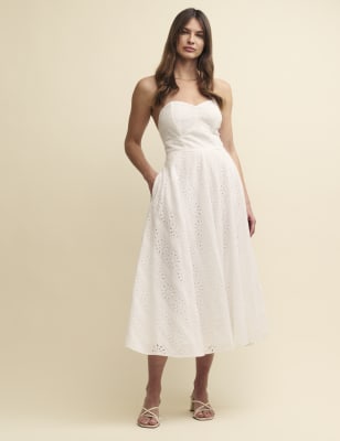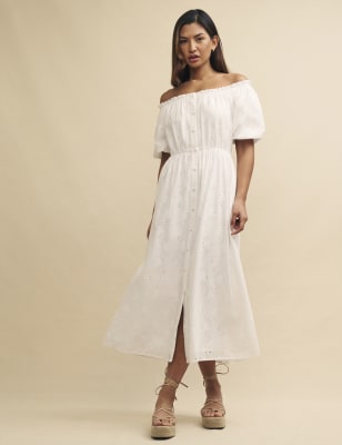 This Nobody's Child dress is the perfect blend of casual and smart. It's cut in a comfy regular fit, with short puff sleeves and a tie detail on the scoop neckline for a feminine feel. The waisted silhouette creates a flattering shape, while the midaxi length brings an elegant drape. This piece is made from breathable pure cotton with all-over broderie embroidery. n Nobody's Child designs are cut to a form-fitting shape, so if you're looking for a more relaxed fit, we recommend choosing the next size up.