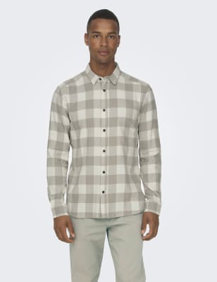 Add a smart touch to your off-duty days with this pure cotton shirt from ONLY & SONS. This flannel piece is cut to a slim fit, perfect for creating a layered look. Long sleeves, a classic collar and a button-through fastening offer timeless appeal. This style is complete with a bold checked design.