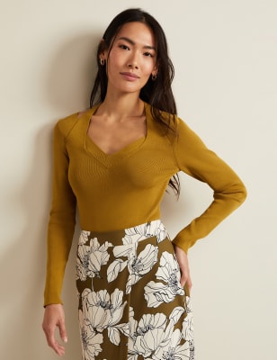 This fine-knit tee from Phase Eight is a warm-weather wardrobe staple. It's made in a regular fit, with a flattering v-neckline and a touch of linen in the yarn for texture. The rolled short sleeves are held in place with metallic buttons on the tabs for a glamorous touch. A ribbed hem completes this easy-breezy look.