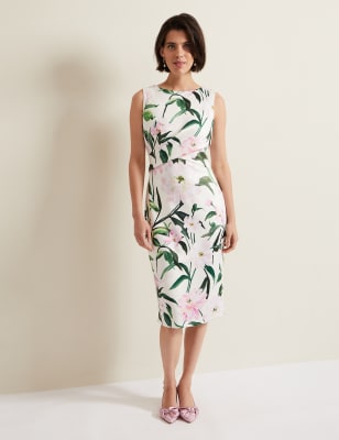This floral lace dress from Phase Eight is a sophisticated choice for special occasions. It's cut in a regular fit, with a timeless sleeveless column silhouette and a midi length. The bodice highlights the waist and features a square neck for an elegant look. A concealed zip fastening at the back ensures a smooth feel. This piece is lined for comfort and coverage.