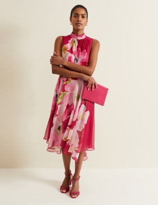 This Phase Eight tea dress has a soft floral print for a gorgeously romantic look. It's made in a comfy regular fit, with a flattering v-neckline and fluttery fluted cuffs on the three-quarter sleeves. The fabric is pleated to give extra drape and movement, while the midi-length hemline is cut in an eye-catching handkerchief style. This piece comes with a belt that pulls you in at the waist and is fully lined for comfort.