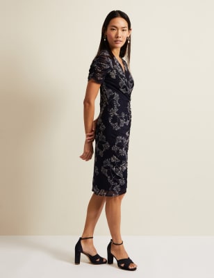 This floral wrap dress from Phase Eight is embellished with glittery polka dots for extra sparkle. It's cut in a comfy regular fit, with a flattering v-neckline and a tie belt so you can adjust the waist. The short sleeves are ruched to give a touch of structure and the curved hemline sits at an on-trend midi length.