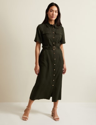 Effortlessly sophisticated, this lyocell™-rich shirt dress from Phase Eight combines an elegant silhouette with a utility-informed aesthetic. Its sleeveless design is cut to a flattering regular fit, with a button-through front that runs from the collared neckline to the midi-length hem. A belt defines the waist, while front flap pockets add further authentic detail. For premium comfort, the piece is fully lined with pure cotton.