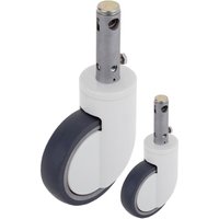 Double wheels with swivel head for hospital stretcher. Wheels for medical beds, modular cabinets, auxiliary and examination tables, multifunctional hospital trolleys, stretchers, etc. Pack of 2 wheels with hollow stem fastening, gray and white. Specifications Double swivel castors for hospital bed with hollow stem fastening. Pack of 2 wheels for multifunctional furniture in hospitals and outpatient clinics. Ball bearing swivel head. Protected precision center bearing. Radius of gyration of each wheel 360º. 120kg load capacity. Ideal for medical applications such as hospitals, outpatient clinics, residences, etc. Made of high quality polyurethane and ABS. 32x50mm hollow stem coupling. Diameter: 125mm Height: 152mm. Width: 76mm.
