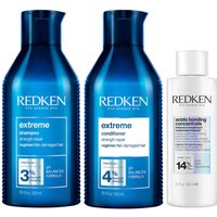 Fortify the appearance of damaged, colour-treated hair with the Redken Acidic Bonding Concentrate set. The kit features a shampoo and conditioner formulated to reduce the look of brittle, split ends, complete with a heat protectant spray.Set Contents:Acidic Bonding Concentrate Shampoo 300mlInfused with a Bonding Care Complex, the shampoo works to strengthen the appearance of hair fibres. Citric acid enhances the formula to rinse away product and oil build-up without compromising the vibrancy of your colour.Acidic Bonding Concentrate Conditioner 300mlThe formula works to minimise the look of split ends and damage, while encouraging a visibly glossy shine. Hair feels more manageable and appears detangled with lightweight nourishment.Thermal Spray Heat Protector 250mlPreviously known as ‘Iron Shape 11’, the spray is designed to defend hair from the visible damage of heated tools, delivering protection up to 230°C.