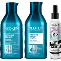 Achieve visibly stronger hair and longer-looking lengths with Redken’s Extreme Length Shampoo, Conditioner and Triple Action Treatment Mask Trio Bundle. Ideal for all hair types, the three-piece set works in harmony to nourish, leaving the tresses looking renewed.Set Contents:Extreme Length Shampoo 300mlGently lifting away dirt and debris, the silky shampoo effectively cleanses the scalp and strands. Enriched with biotin, it promotes a stronger-looking finish.Extreme Length Conditioner 300mlIntensely hydrating, the creamy formula provides moisture to the hair fibre, visibly diminishing the look of split ends and breakage. Castor seed oil helps to nourish for a touchably soft result.Triple Action Treatment Mask 250ml Powered by exclusive technology, the five-minute mask works to promote the look of stronger, smoother hair. Fortified with a blend of biotin, niacinamide and castor oil, the hair mask nourishes strands to reduce the appearance of lacklustre lengths.