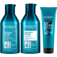 The quest for dreamy lengths begins with the Redken Extreme Shampoo, Conditioner and Extreme Length Sealer Leave-in Treatment Bundle. Designed for dry, brittle and damaged hair, the set promotes smooth-looking, soft-feeling and more manageable hair.Set Contents:Extreme Shampoo 300mlFormulated with proteins and the brand's Strength Complex, featuring amino acids, the silky shampoo helps to protect the hair against excess breakage and the appearance of split ends, nourishing the strands with hydration for a glossy finish.Extreme Conditioner 300mlIdeal for damaged hair, the nourishing formula is designed to minimise the risk of breakage. the conditioner instantly detangles for enhanced manageability, while helping to leave the strands feeling stronger. The formula is enriched with a Length Care Complex, encouraging a thicker, fuller-looking appearance. Castor oil sets to work to moisturise the lengths and support a visibly glossy shine.Extreme Length Leave In Treatment 150mlLightweight and easy to apply, the hair treatment wraps your strands in nourishing properties, designed to achieve a silky finish. Targeting the look of split ends, the formula utilises weightless conditioning benefits to help soften coarse texture. Topped with Biotin, a B Vitamin upheld for its hair-loving benefits, the treatment replenishes lost moisture to encourage show-stopping results.