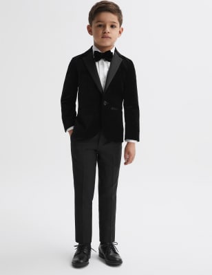 Complete their formal look with this wool-blend blazer from Reiss. This sleek, single-breasted design is fully lined and fastens with a single button. For classic tuxedo style, satin trims feature on the peak lapels and front welt pockets. Two back vents allow non-restrictive movement. The piece is finished with button cuffs, plus a traditional pocket on the chest.