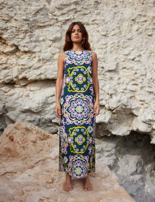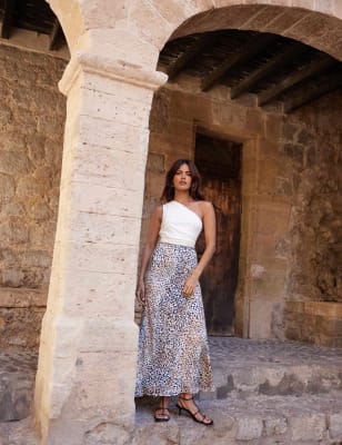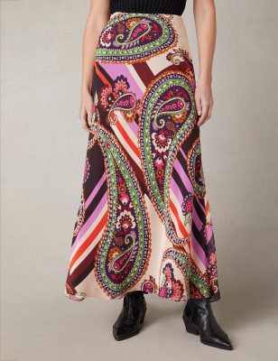 A vibrant geometric print gives this Ro&Zo skirt a definite boho-inspired energy. This flattering number is cut to a regular fit, with an A-line silhouette and ankle-grazing, maxi-length hem. A piped trim adds neat detail to the waistband, which fastens with a discreet zip on the side.