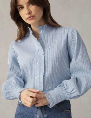 With its pretty broderie embroidery, this long-sleeved blouse from Ro&Zo brings easy elegance to your warm weather line-up. It's cut from pure cotton to a relaxed fit, with a flattering shirred waist and a picot-trimmed v-neckline. The body is lined for coverage, while neatly covered buttons on the centre front and cuffs complete the look.
