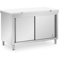 Compact work cabinet with sliding doors and 30 mm strong cutting plate Whether in restaurant, canteen, hotel, bakery, hospital or large kitchen: stainless steel furniture forms the basis for clean kitchen and the hygienic handling of food of all kinds. The work cabinet with cutting plate From Royal Catering belongs to every professionally furnished kitchen and especially corresponds to the high requirements in the catering trade. Resilient - Stainless steel work cabinet with a load capacity of a maximum of 500 kg distributed on three levels Practical - stainless steel cabinet with 140 x 60 cm large work surface on a working height of 95 cm space-saving-two practical sliding doors make the gastro work cabinet ideal for use even in tight kitchens professionally-high-quality stainless steel for a hygienic, durable and easy-to-care work cabinet stable - Robust construction with 30 mm thick cutting plate for daily use and height -adjustable stainless steel feet
