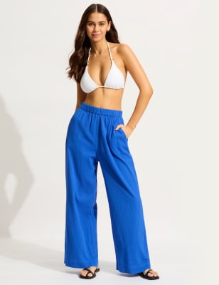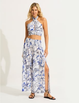 With their gorgeous print and lightweight silk-blend fabric, these Seafolly beach trousers are a stylish choice for your next trip. They're cut in a regular fit, with a soft elasticated waistband and a drawstring tie detail. The wide legs create an easy-breezy relaxed silhouette.