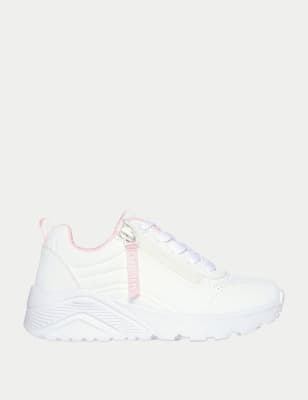Young kids will be ready to take on the day in these vibrant trainers from Skechers. They're made with glittery uppers and colourful stripes at the toes. For easy wear and a comfortable fit, they fasten with riptape straps. The modern chunky soles are finished with light-up hearts to complete the playful design.