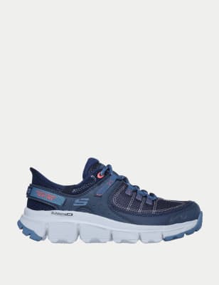 Get ready to hike with these durable lace-up trainers from Skechers. They feature a chunky rubber sole for a comfortable stride, plus memory foam in the insole and collar for a cushioned feel. The mixed-textile upper and subtle branding add a fun pop of colour to your walking ensembles.