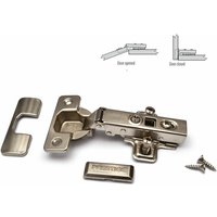 35 mm hinge cup 100 degree opening angle full overlay clip-on soft close system (hydraulic) - 3D ECCENTRIC ADJUSTMENT modern design fixing screws - 2 wood screws + 2 euro screws - per hinge 1 masking cover - per hinge Please Choose Quantity From Menu