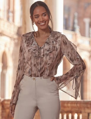 Bring a standout feel to smart and casual outfits alike with this abstract animal print blouse from Sosandar. Its relaxed fit gives a loose, flowing silhouette, while frilled trims on the long sleeves create fluttery movement. Metallic stripes in the semi-sheer fabric add a touch of sparkle, while a tie at the neck lets you wear it your way. This piece is part lined for coverage.