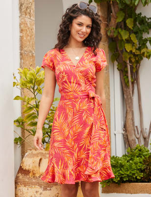 Sosandar Women's Floral Tie Neck V-Neck Knee Length Beach Dress - 20 - Pink Mix, Pink Mix