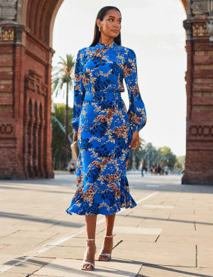 This chain print tea dress from Sosandar strikes the perfect balance between playful and sophisticated. It's crafted to a regular fit, with three-quarter sleeves and a zip fastening at the back. For a feminine look, the bodice features a twisted high neckline and a flattering keyhole opening. A breezy split in the midi-length skirt enhances this design with contemporary charm.