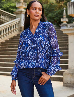This Sosandar blouse is crafted from pure cotton broderie fabric, making it a light and airy choice for warm days. It's cut to a regular fit, with a v-neckline that features a ruffle that continues down the front. The three-quarter length sleeves are gathered at the shoulders for a touch of volume and end in pretty ruffle cuffs. A deep frill at the hem completes this joyful piece.